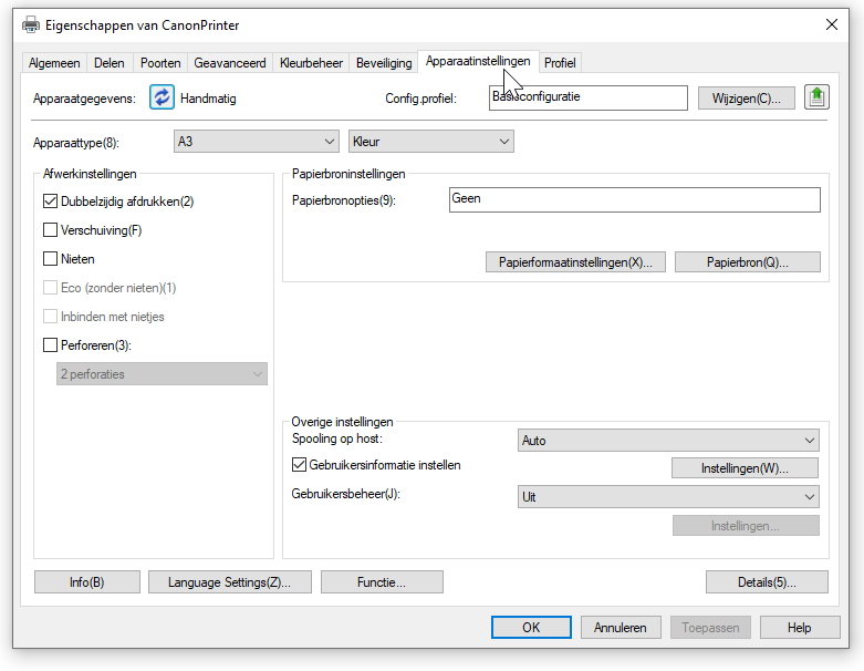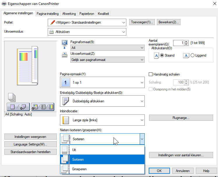 Standaard krijg je onderstaande opties voor nieten/sorteren/groeperen. Om documenten met nietjes af te drukken dien hiervoor éénmalig de instelling handmatig aan te passen.