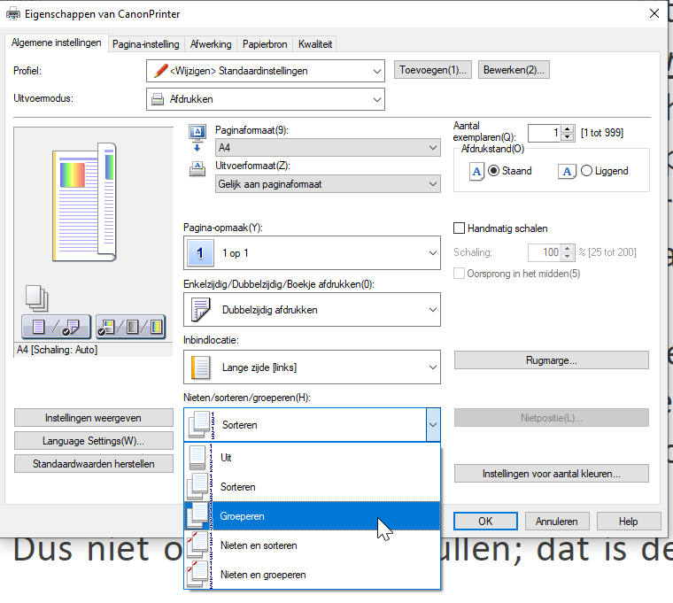 Wanneer je nu een document afdrukt krijg je de opties "Nieten en sorteren" en "Nieten en groeperen" erbij.
